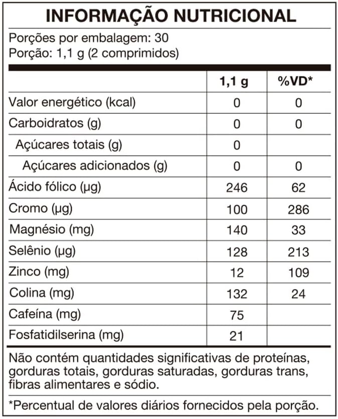 O suplemento contém Fosfatidilserina, Cafeína, Colina, além de Vitaminas e Minerais.