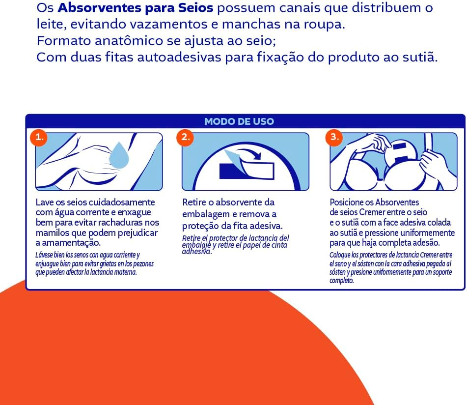 Os Absorventes para Seios Cremer foram projetados para oferecer conforto e proteção durante a amamentação. Eles ajudam a absorver o excesso de leite materno, garantindo que você se sinta seca e segura. Com um adesivo fixador que se estende por toda a superfície, eles permanecem no lugar, proporcionando discrição e higiene. Além disso, são dermatologicamente testados, garantindo que sejam suaves para a pele sensível.