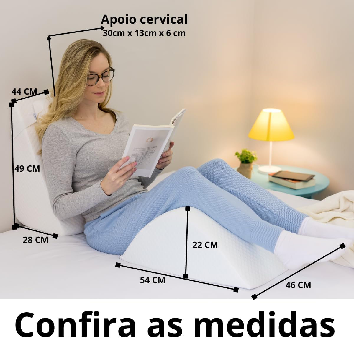 A almofada possui um design ergonômico em formato de cunha, permitindo que você se sente ou deite em uma posição inclinada e confortável.