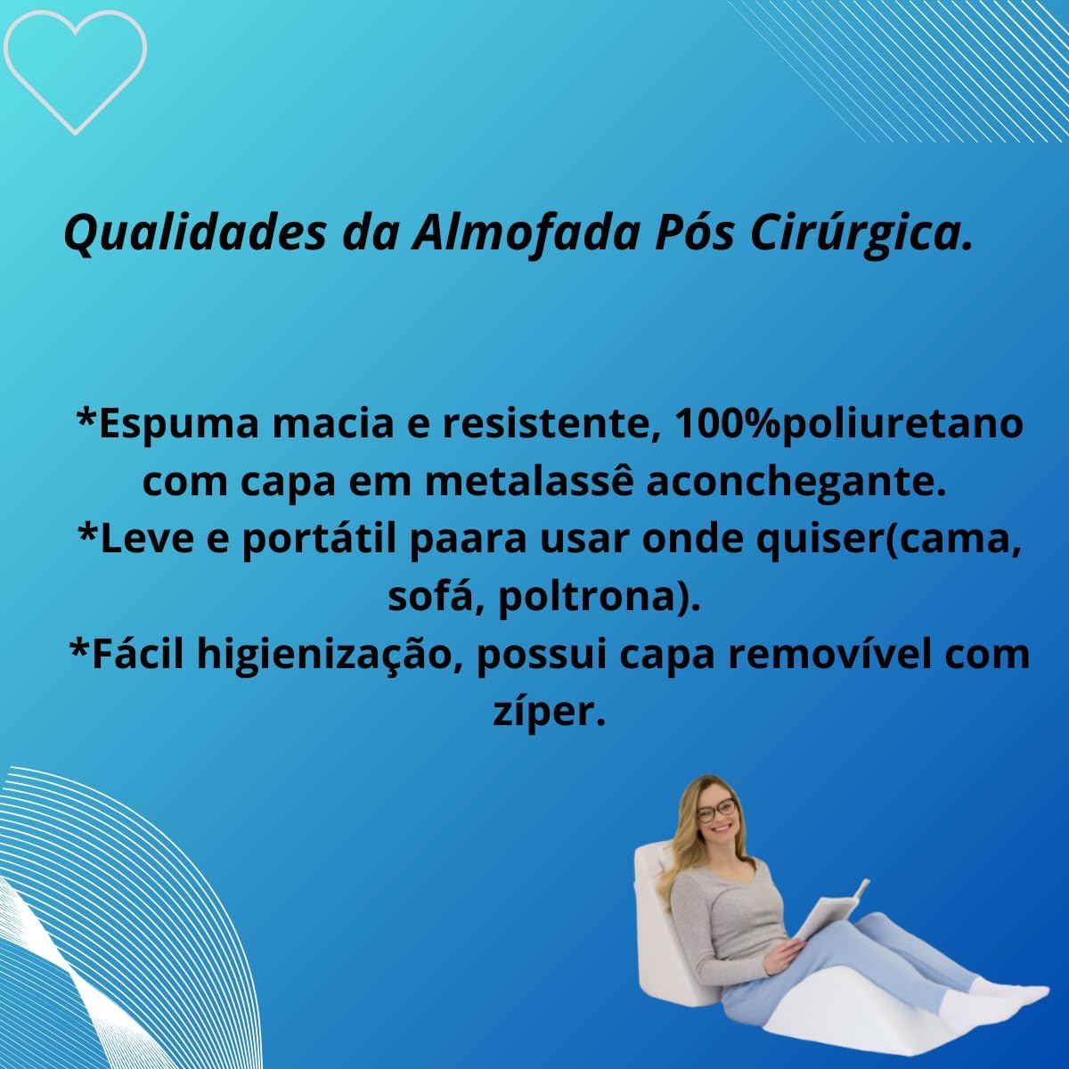 A almofada é ideal para pessoas em processo de recuperação pós-cirúrgica, especialmente após abdominoplastia, ou para quem deseja mais conforto no dia a dia.