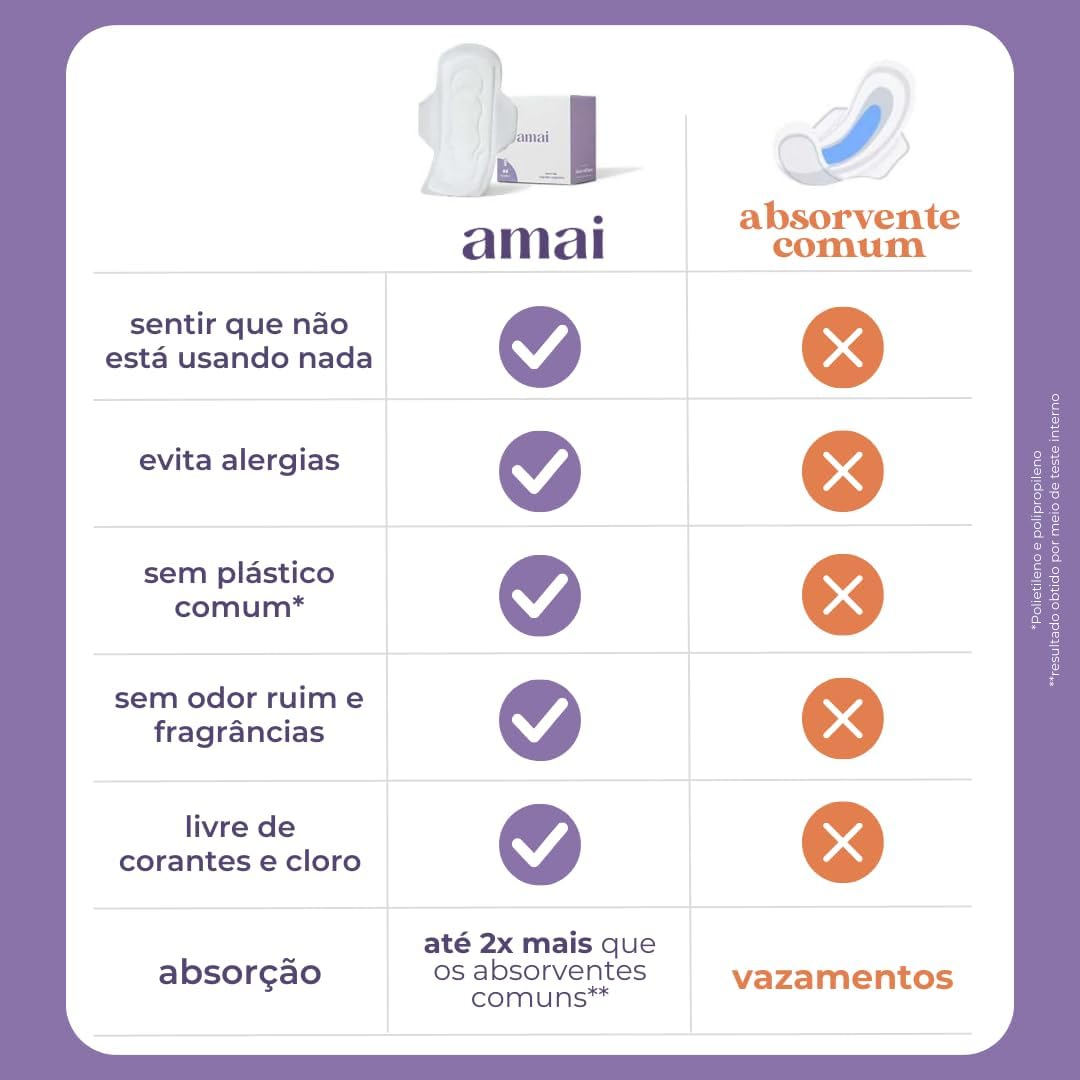 Amai, Absorvente Externo Fluxo Regular, Algodão Sem Químicos, Hipoalergênico, Sem plástico comum, Com Abas – 14 unidades