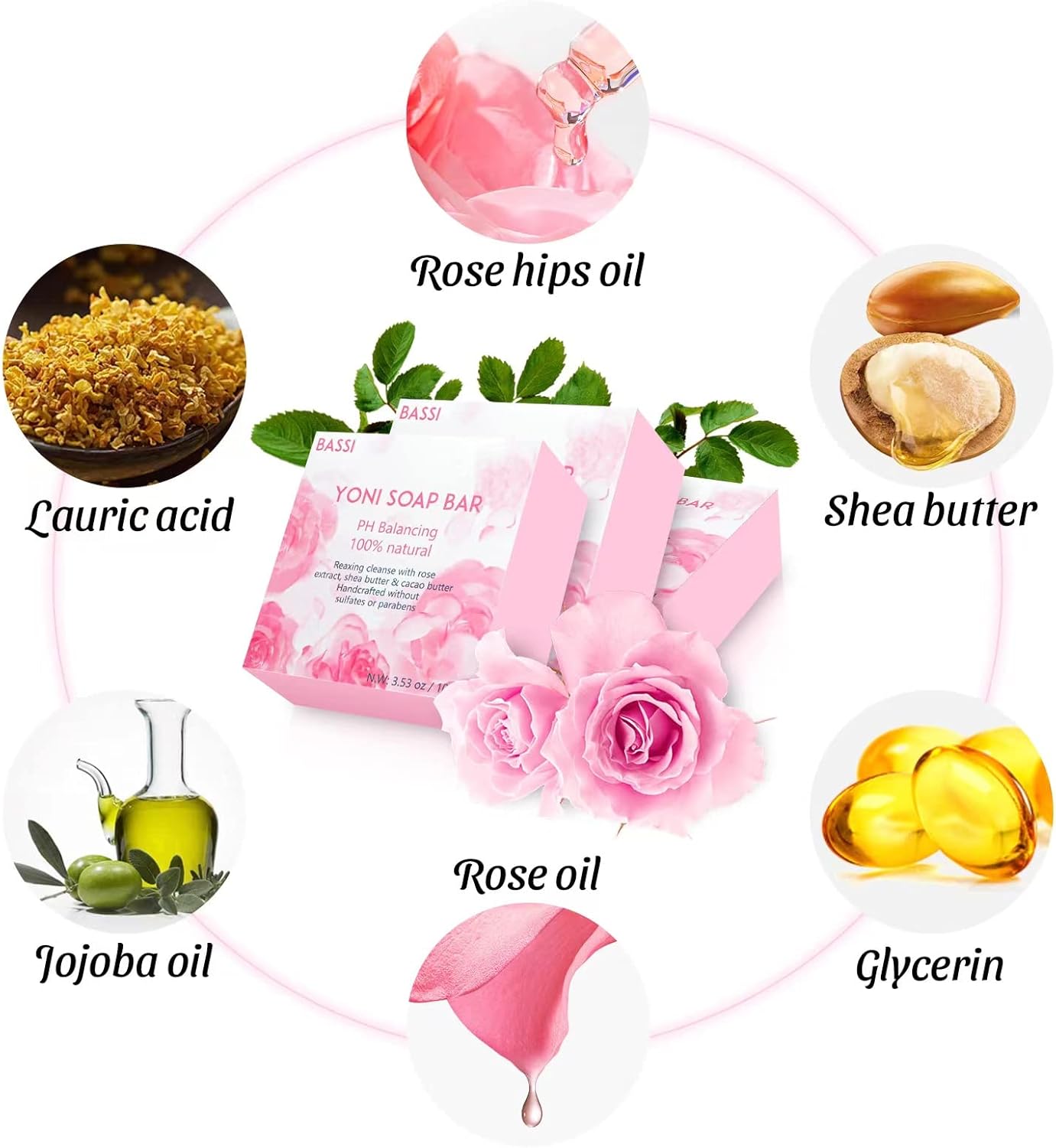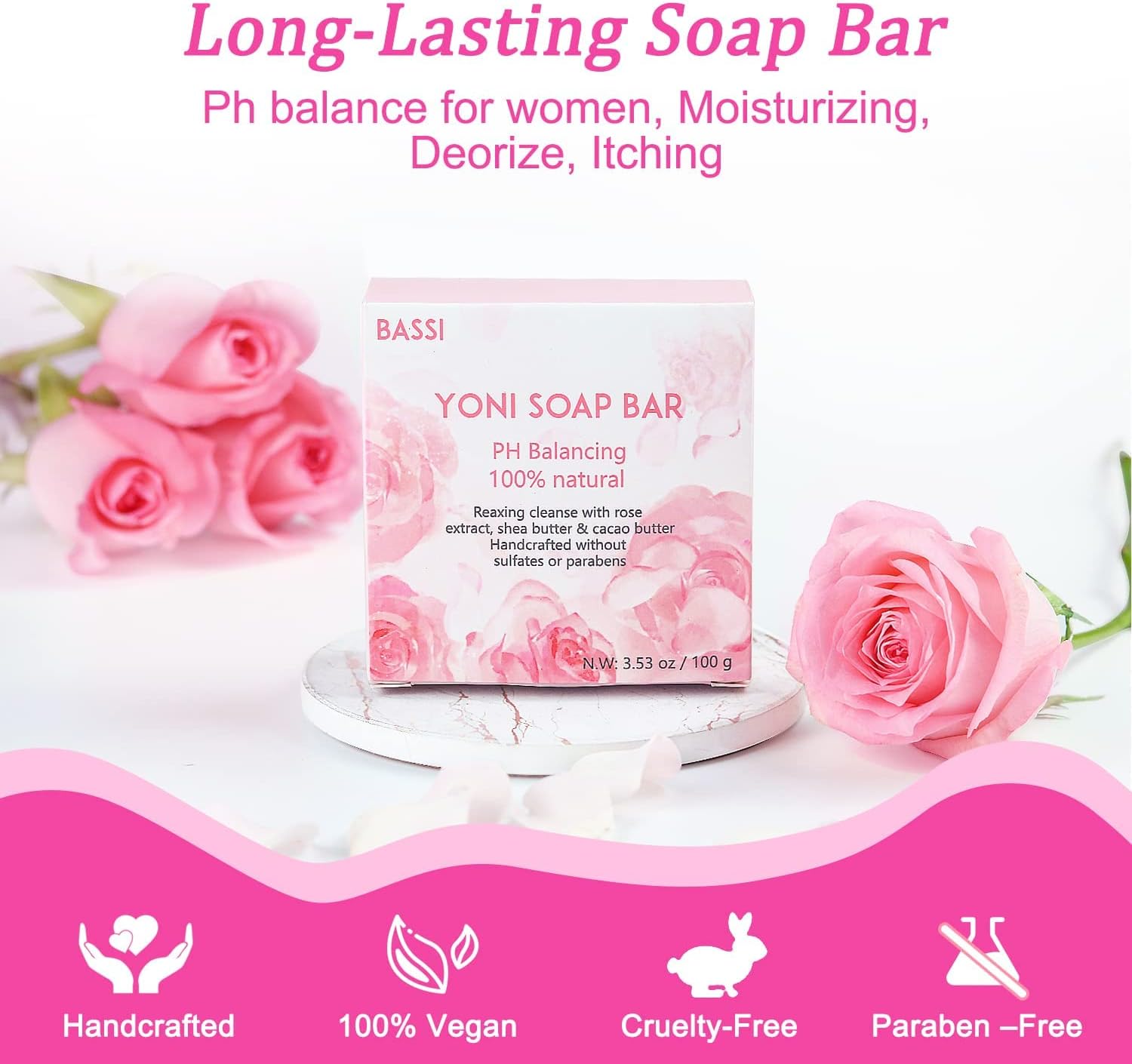 O BASSI Sabonete Íntimo Yoni Em Barra é uma escolha natural e orgânica para o cuidado da área íntima feminina. Cada sabonete pesa 100g e possui um pH balanceado, ideal para a limpeza suave da pele. Os ingredientes incluem pétalas de rosa, óleo de rosa mosqueta e manteiga de karité, proporcionando hidratação e evitando irritações. O produto vem em uma embalagem atraente, tornando-o um excelente presente para mulheres e meninas.