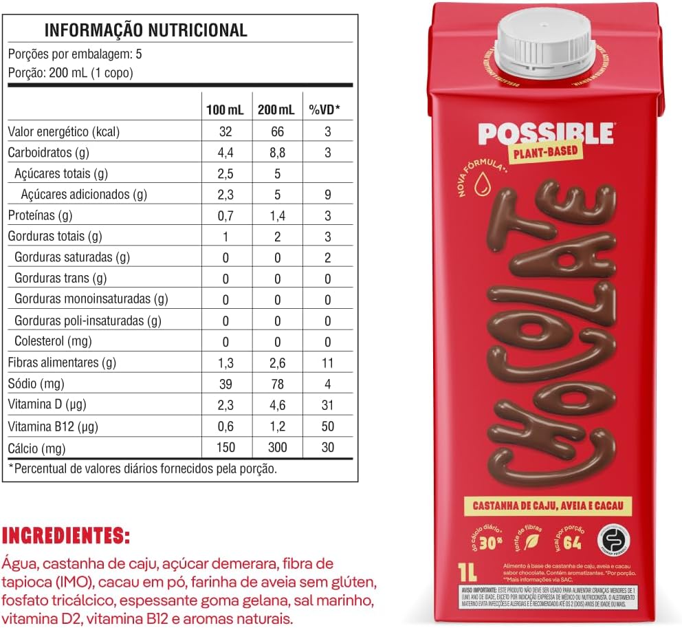 A Bebida Vegetal Possível Chocolate 1L é uma excelente opção para quem busca uma alternativa saborosa e saudável. Feita com ingredientes orgânicos, esta bebida é isenta de lactose e colesterol, tornando-a adequada para a maioria das pessoas, exceto aquelas com alergia aos ingredientes. Seu sabor leve é realçado pela adição de açúcar demerara, proporcionando um toque doce sem conservantes.