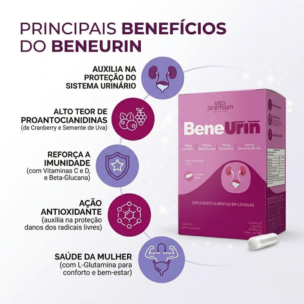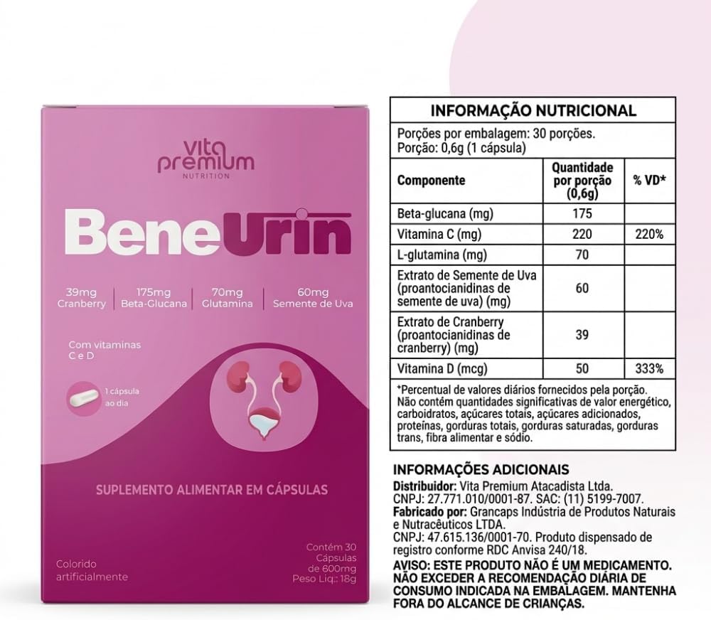 O BeneUrin da Vita Premium é um suplemento alimentar em cápsulas que visa auxiliar na saúde do trato urinário. Com uma fórmula exclusiva, ele combina extrato de Cranberry, Beta-glucana e Glutamina, além de Semente de Uva e Acerola em pó. Este produto é enriquecido com Vitaminas C e D, que atuam como antioxidantes e ajudam a fortalecer o sistema imunológico. Cada embalagem contém 30 cápsulas, com a recomendação de uso de apenas uma cápsula ao dia, o que facilita a adesão ao cuidado diário.