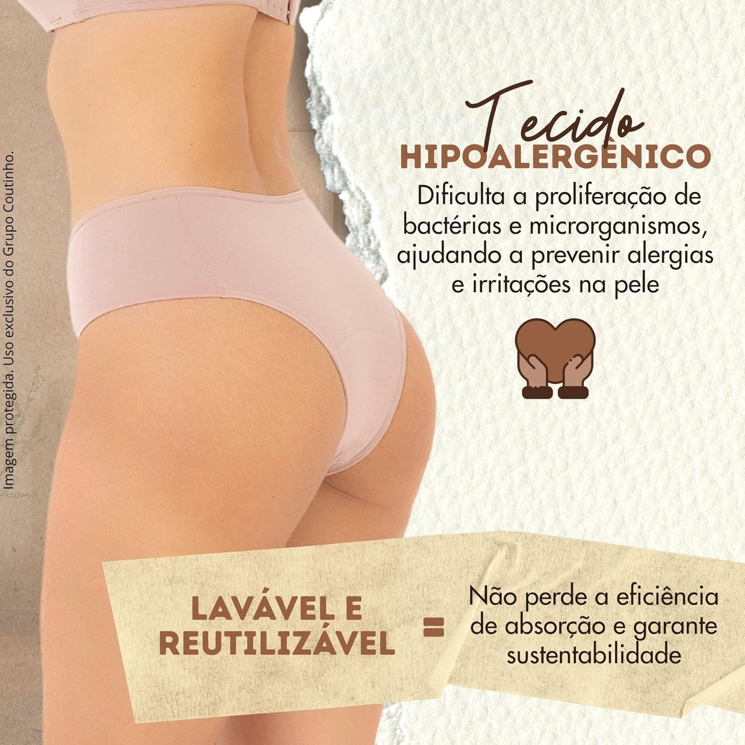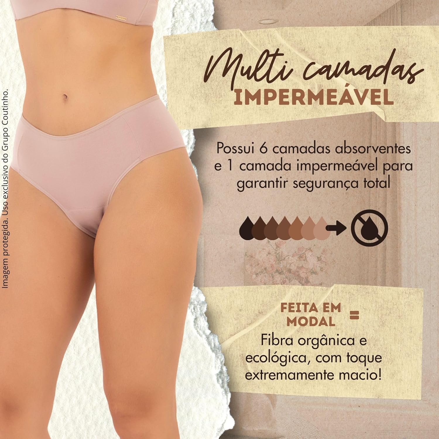Construída com múltiplas camadas, a calcinha possui seis camadas absorventes e uma camada impermeável, evitando vazamentos. Seu forro em algodão hipoalergênico previne irritações, enquanto a fibra de modal sustentável proporciona um toque macio e respirabilidade.