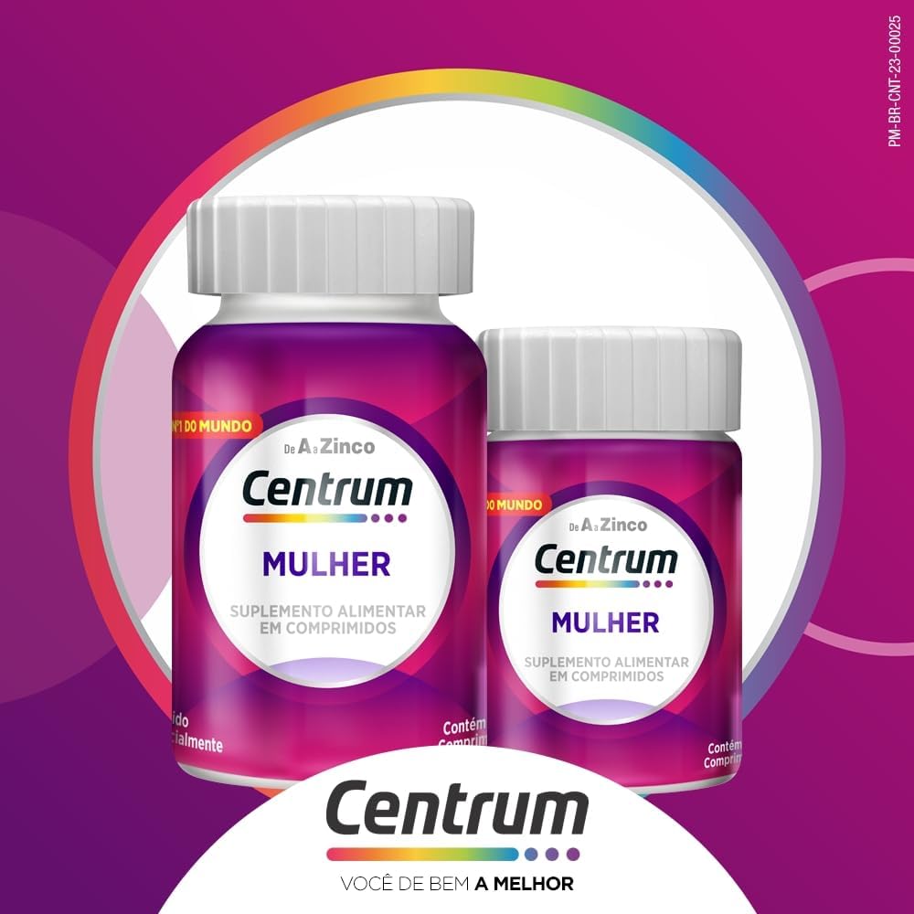 Centrum Mulher é um polivitamínico que contém 23 micronutrientes essenciais para a saúde dos cabelos, pele e unhas. Este suplemento é formulado com vitaminas e minerais que ajudam a manter o bem-estar feminino. É sugerido o consumo diário de um comprimido, respeitando a dose recomendada. O produto é livre de glúten, açúcares e colesterol.