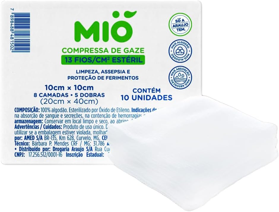 Compressas de Gaze Mió 13 Fios Estéril 10cm X 10cm com 10 Unidades