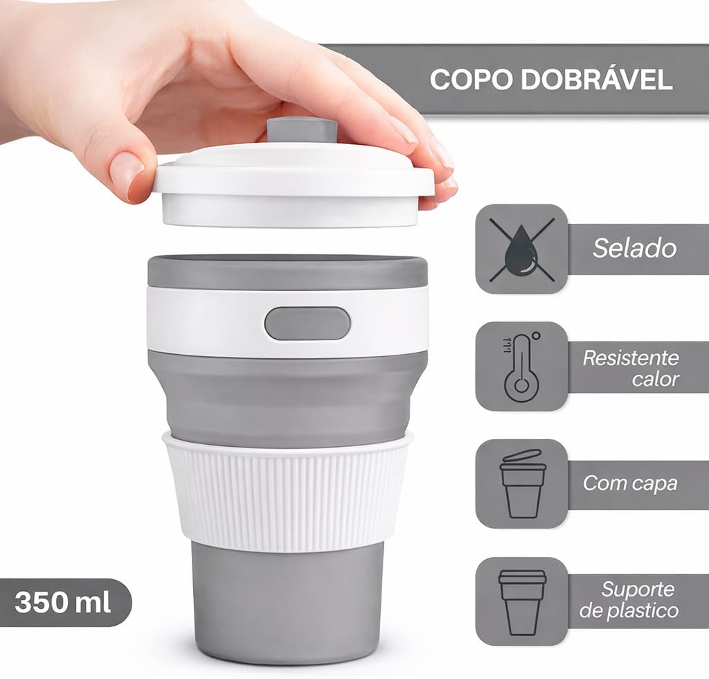 O Copo de Silicone Dobrvel 350ml a solu ideal para quem busca pr ticidade e sustentabilidade no dia a dia. Com um design inovador, ele pode ser facilmente dobrado, ocupando pouco espao na bolsa ou mochila. Feito de silicone reutiliz vel de alta qualidade, este copo resistente a diversas temperaturas, tornando-o perfeito para bebidas quentes ou frias.