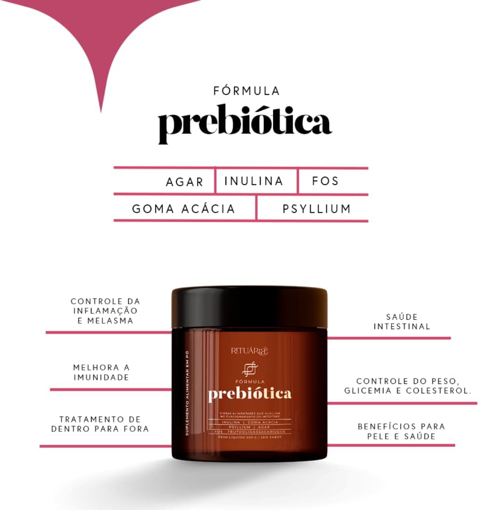 A Frmula Prebitica Rituria um suplemento em p de fibras alimentares que ajuda a manter o equilbrio da microbiota intestinal e proporciona conforto digestivo. Com uma combina de ingredientes como Inulina, FOS, Goma Accia, Psyllium e gar, este produto promove a regula do intestino e melhora a absor de nutrientes. Ideal para misturar em gua, sucos ou shakes, uma op vegana, sem glten e sem a de acar. Inclua na sua rotina diria para um suporte sade intestinal e bem-estar geral.