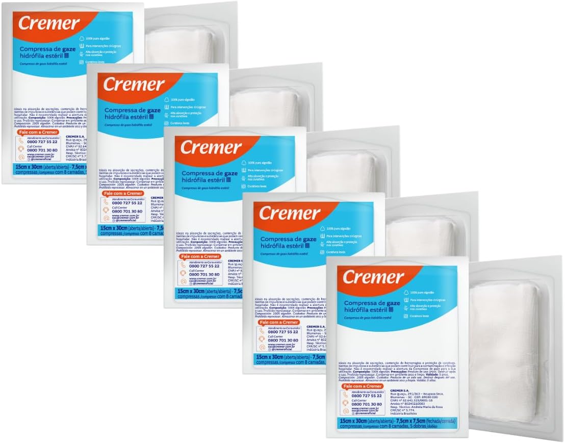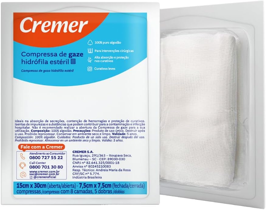 A Compressa de Gaze Estéril Cremer é ideal para absorção de secreções e controle de sangramentos. Produzida com 100% algodão puro, garante maciez e alta absorção, sendo segura para o contato com a pele. É isenta de impurezas, o que a torna perfeita para ambientes hospitalares e clínicos. Este produto é estéril e deve ser utilizado com cuidado para manter sua integridade.