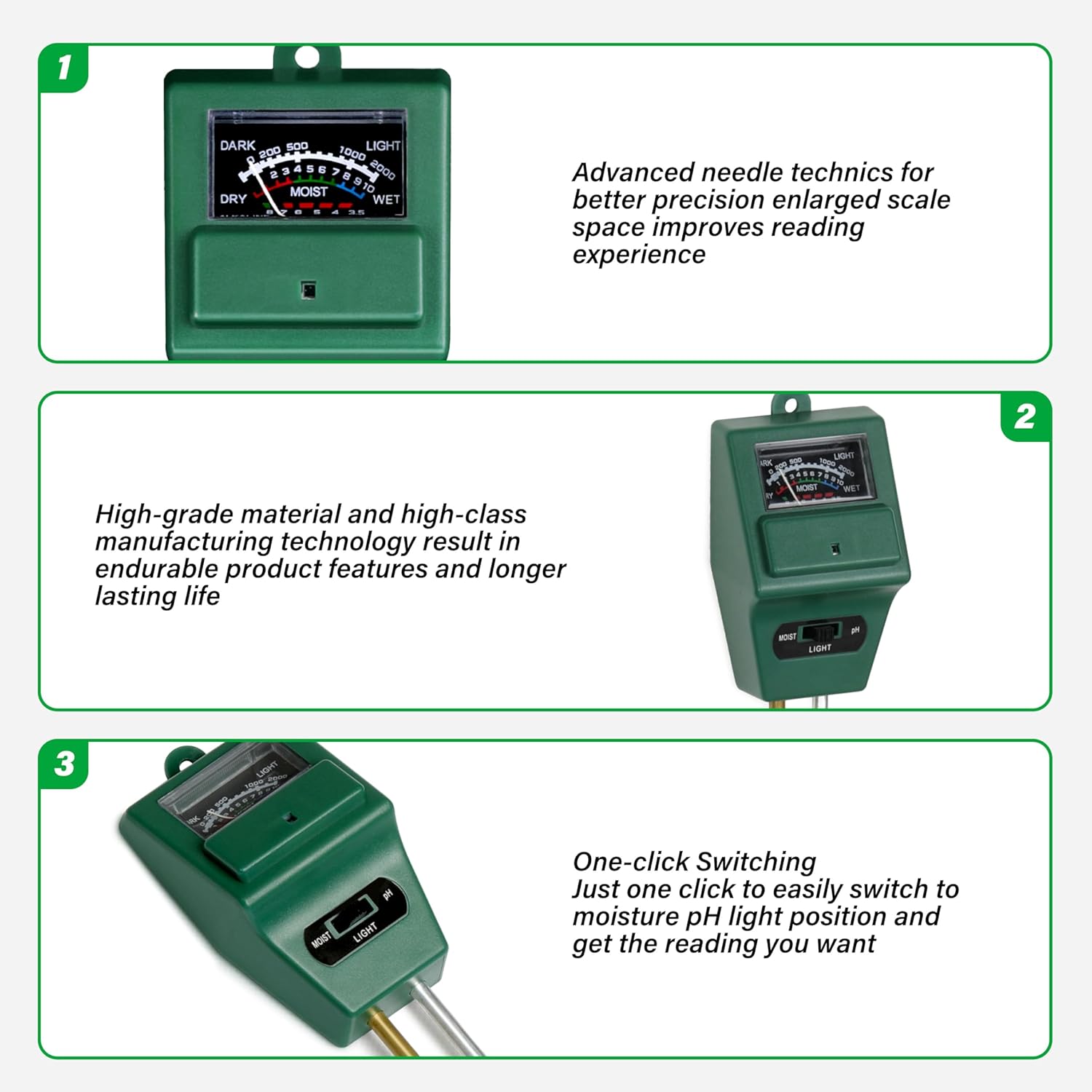 iPower Kit de teste de solo 3 em 1 para uso interno e externo, sem necessidade de pilhas, verde