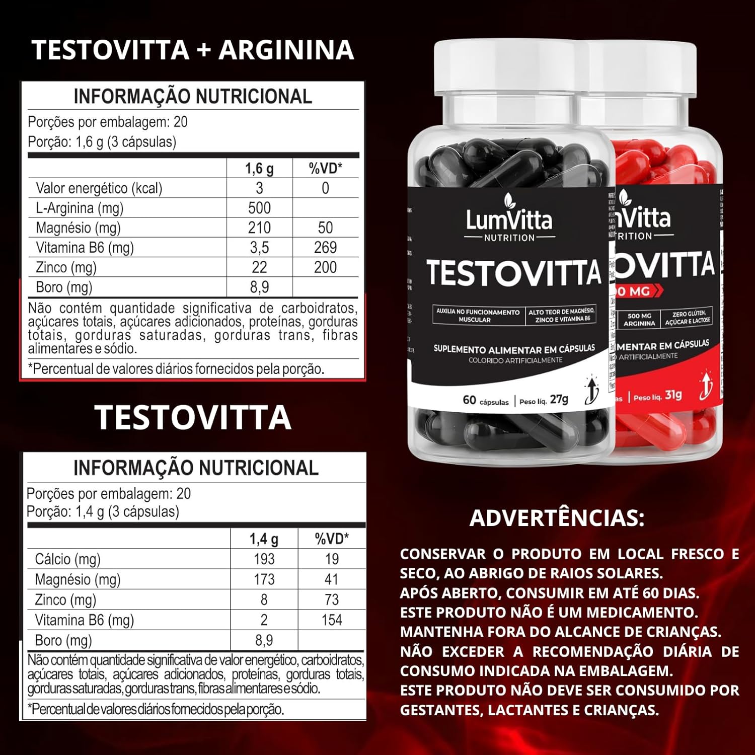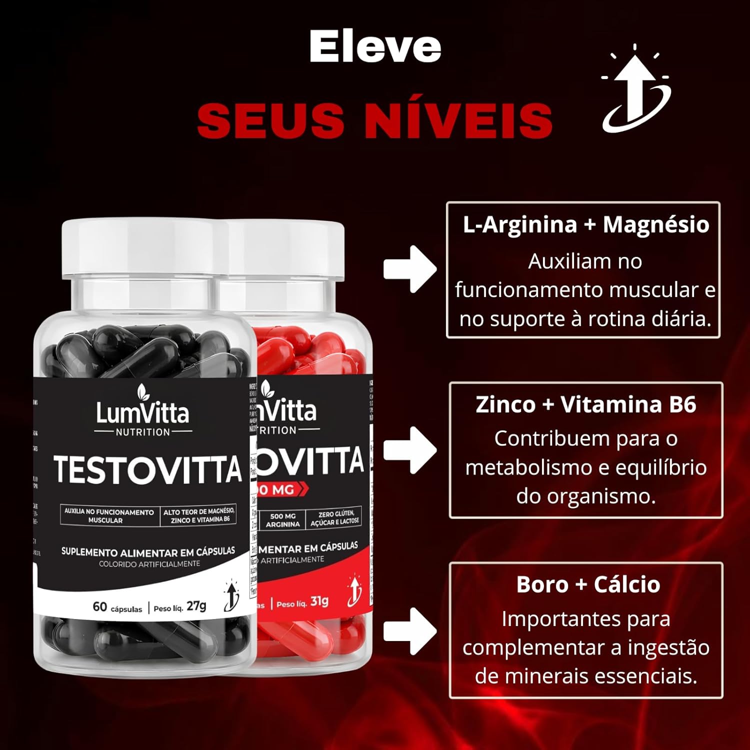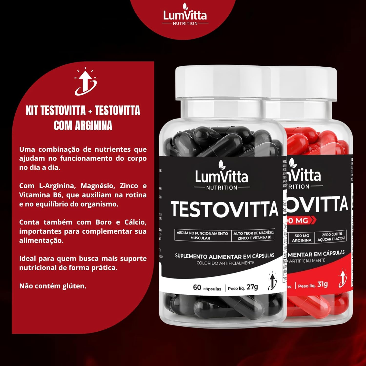 O Kit Testovitta + TestoVitta Arginina é uma combinação de suplementos que visa fornecer suporte nutricional essencial para energia, metabolismo e desempenho. Este kit contém ingredientes como L-Arginina, que ajuda na produção de óxido nítrico, e minerais como Cálcio, Magnésio e Zinco, que são fundamentais para várias funções metabólicas.