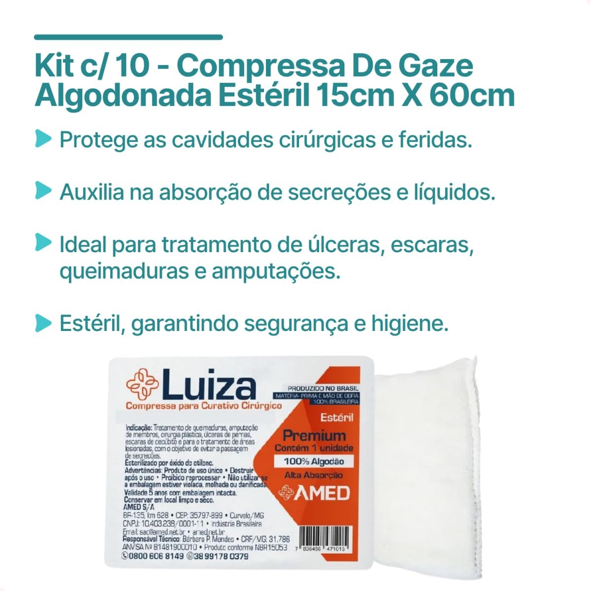 O Kit com 10 - Compressa De Gaze Algodonada Estéril 15 X 60cm é ideal para o tratamento de feridas e lesões cirúrgicas. Confeccionadas com camada de algodão hidrófilo e recobertas por tecido de gaze, essas compressas são estéreis, garantindo segurança e higiene. O tamanho de 15 x 60 cm é perfeito para diversas aplicações, como curativos cirúrgicos e tratamento de úlceras.