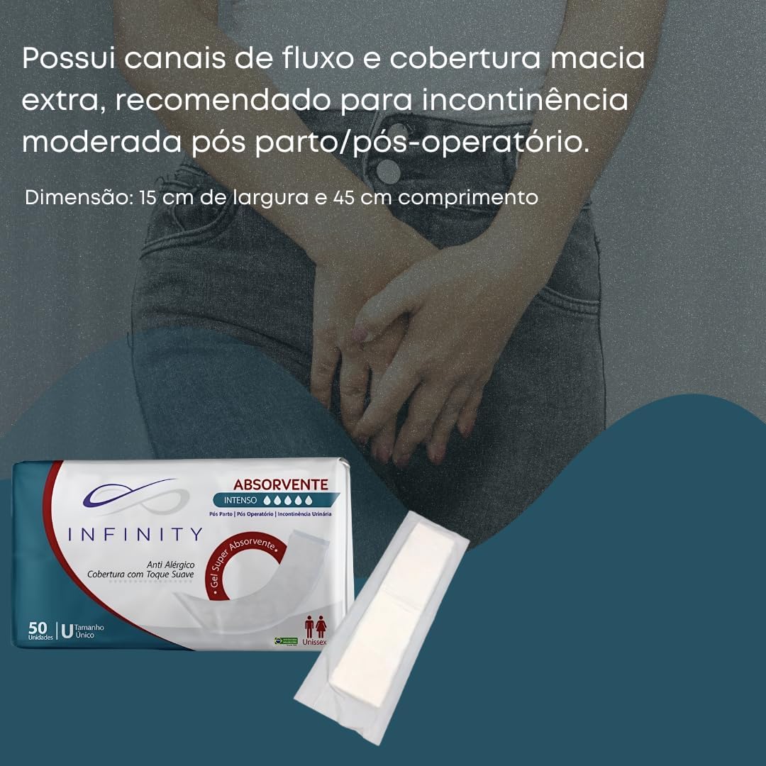 O Kit com 3 Pacotes de Absorvente Geriátrico Infinity é ideal para quem precisa de proteção durante a incontinência urinária moderada, especialmente pós-parto ou pós-operatório. Com uma cobertura extra macia, esses absorventes foram projetados para proporcionar conforto e segurança. Possuem canais de fluxo que ajudam na distribuição do líquido, evitando vazamentos e garantindo uma experiência mais tranquila.