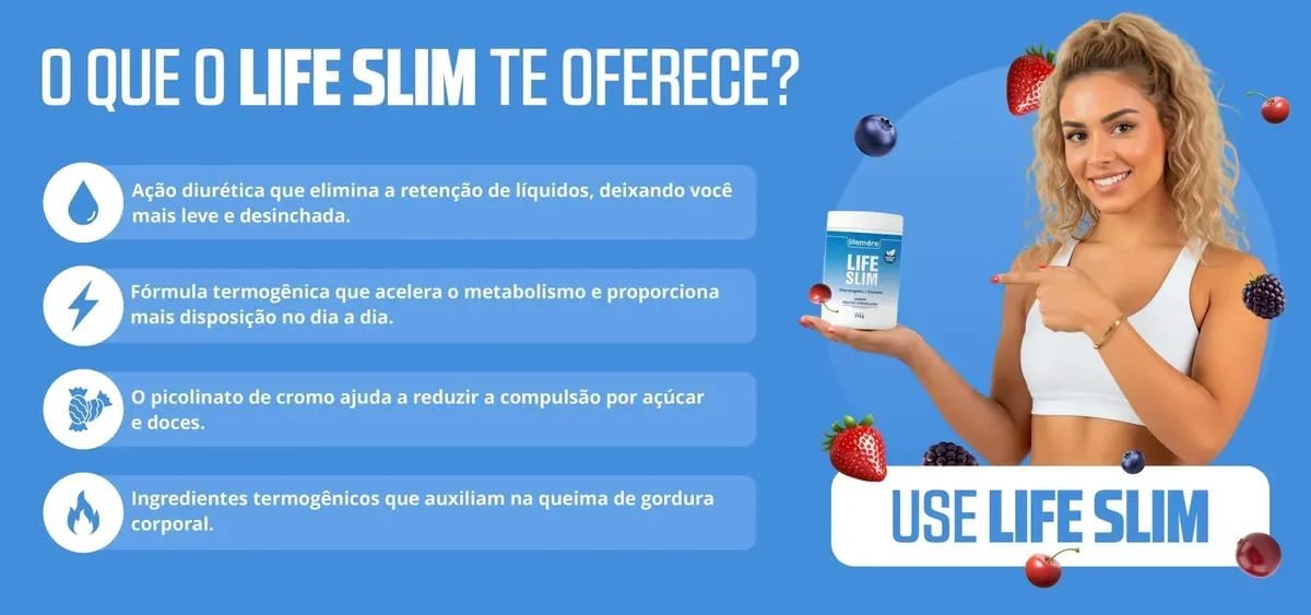 O Life Slim é um suplemento alimentar desenvolvido para auxiliar na rotina de pessoas que buscam mais equilíbrio, disposição e foco no dia a dia.