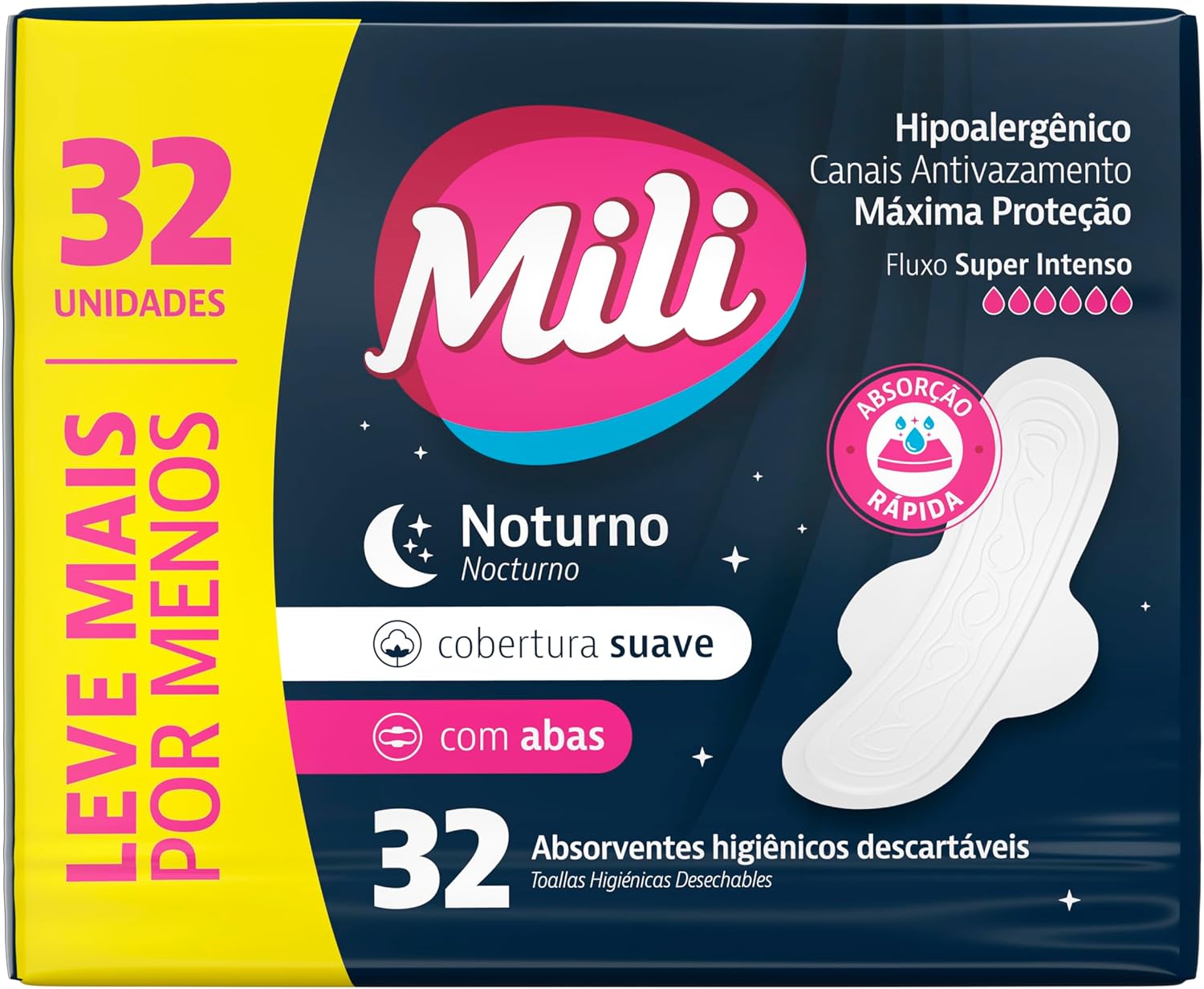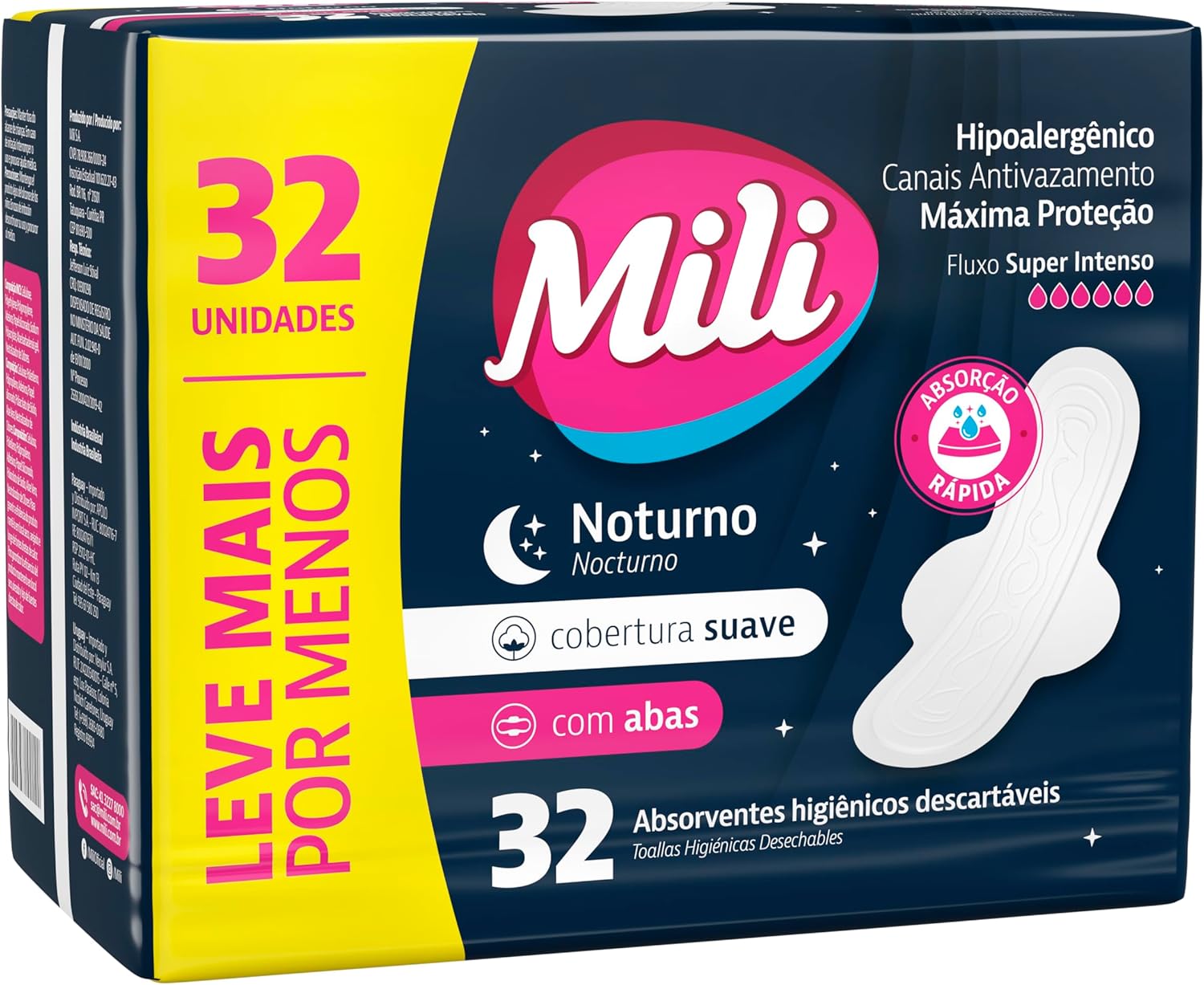 Mili Absorvente Externo com Abas Cobertura Suave, Noturno, Fluxo Super Intenso, 32 Unidades
