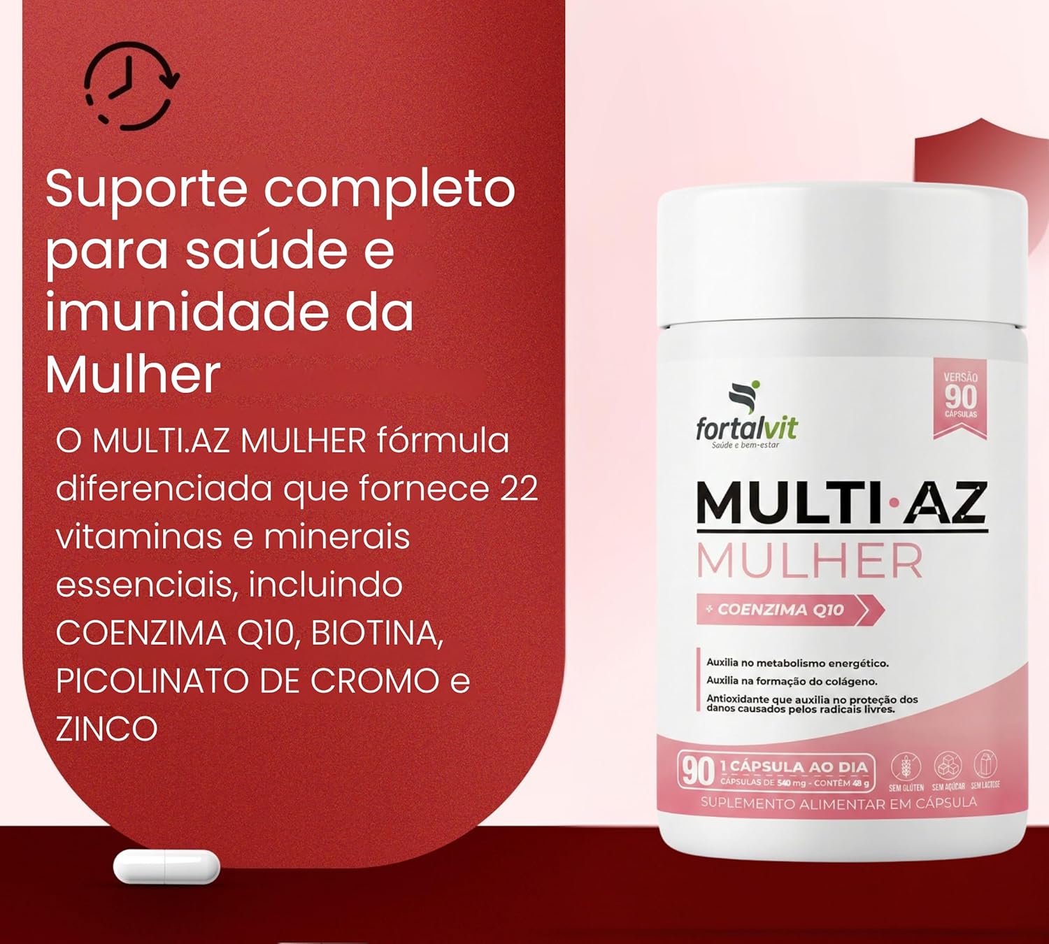 Multi AZ Mulher Com Coenzima Q10 Longa Duração: 3 Meses de Uso, 21 Vitaminas e Minerais Essenciais, 90 Cápsulas, Multivitamínico Feminino, Fortalvit