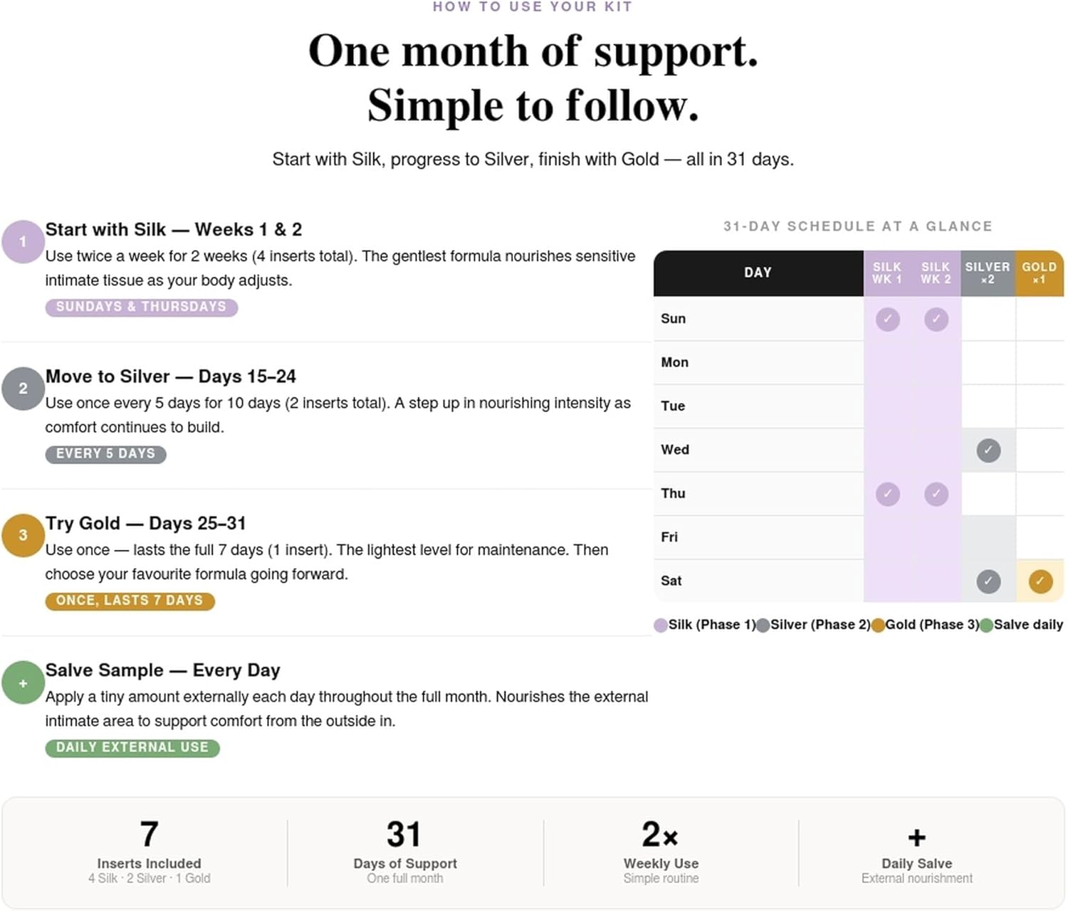 Ideal para mulheres com menos de 55 anos, o uso regular pode ajudar a combater o ressecamento. É recomendado começar com a fórmula Seda suave e, gradualmente, progredir para as fórmulas Prata e Ouro. Mantenha refrigerado antes de usar, especialmente em climas quentes.