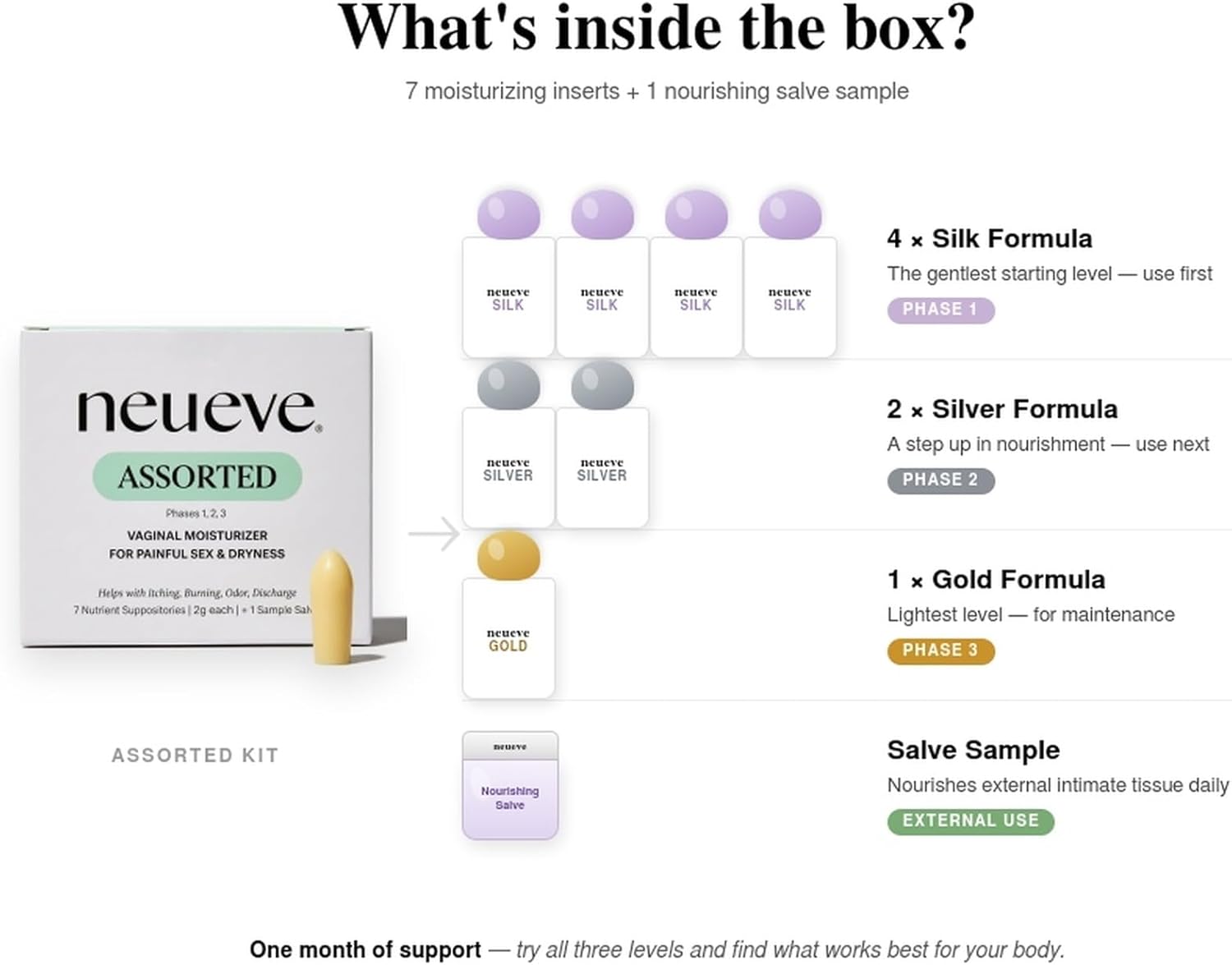 NeuEve Kit Variado de Hidratantes Vaginais – 4 Fórmulas Seda, 2 Prata, 1 Ouro | Ingredientes Naturais | 7 Unidades | Suprimento para 1 Mês + Pomada Tópica Em Tamanho Viagem