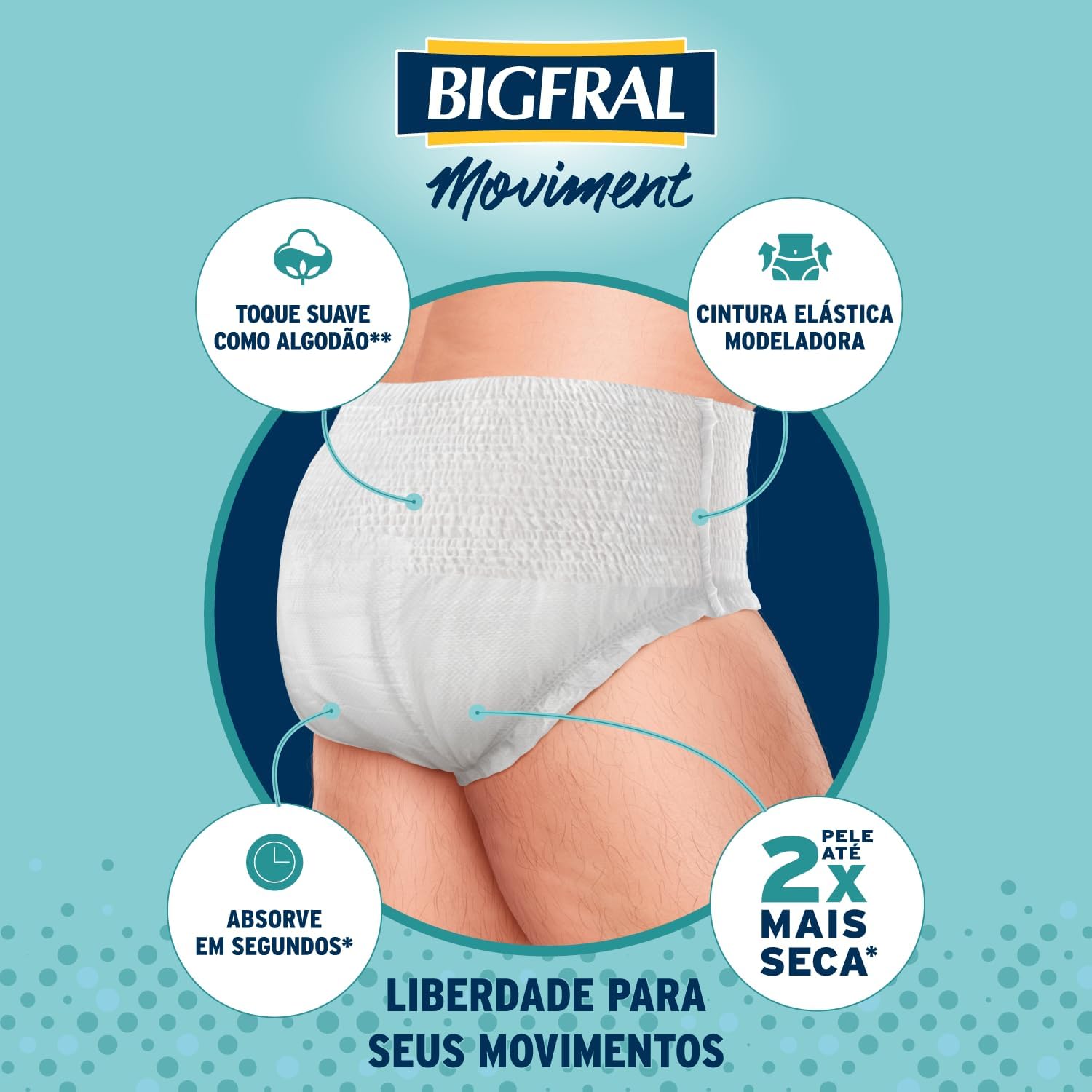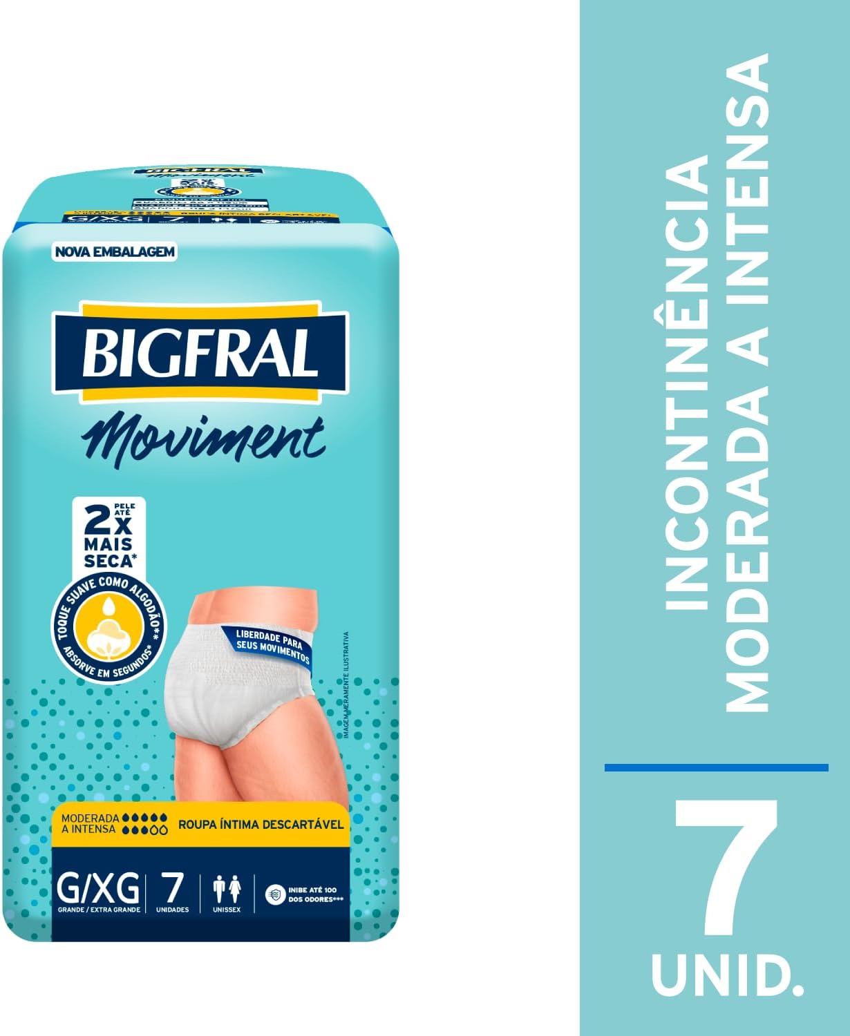 A Roupa Íntima Bigfral Moviment é especialmente projetada para mulheres que enfrentam incontinência moderada a intensa. Com um toque suave como algodão, proporciona conforto e discrição. Este produto se destaca por sua capacidade de absorção rápida, mantendo a umidade longe da pele e deixando-a até 2x mais seca. Além disso, suas barreiras antivazamento e controle de odores garantem segurança durante o uso.