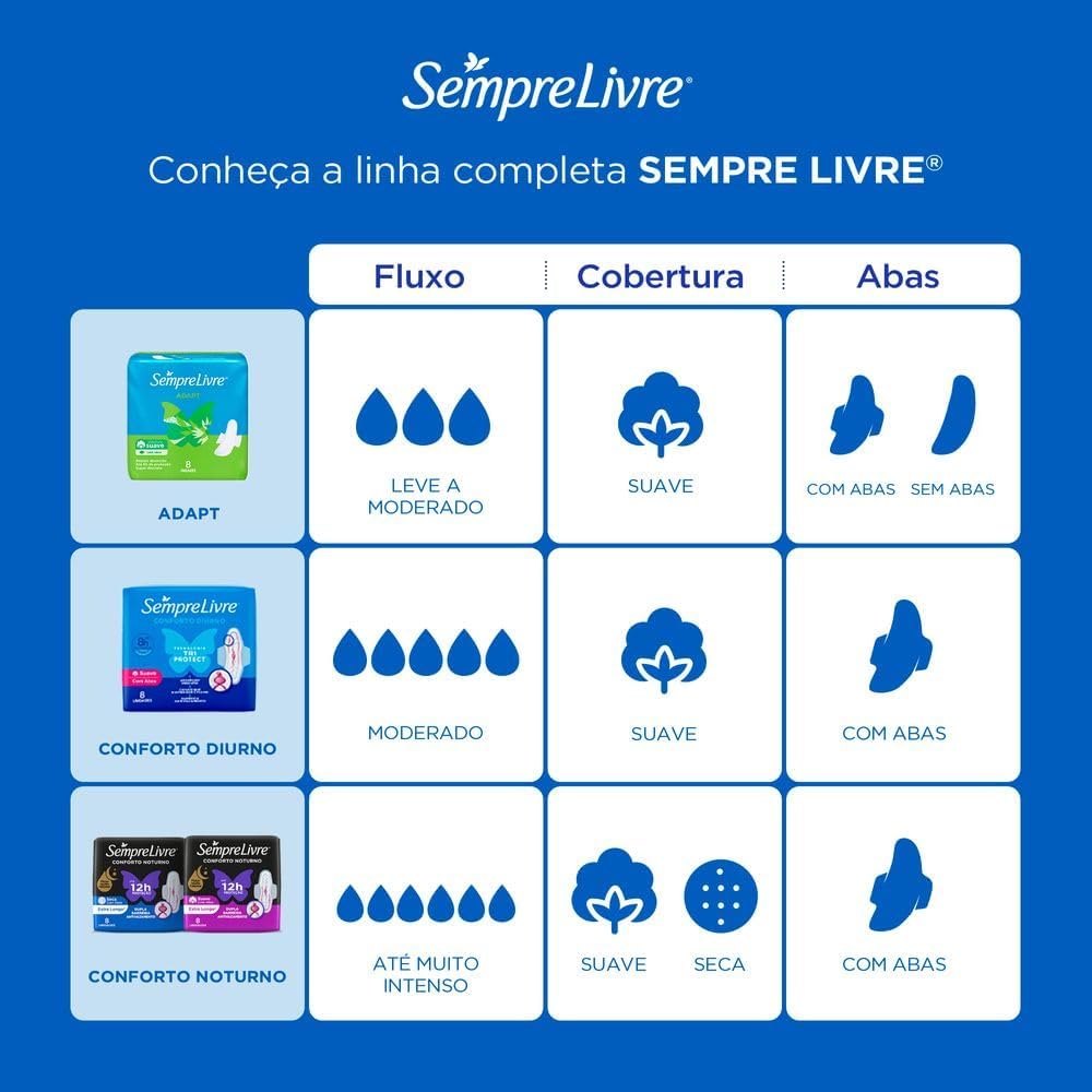 O Sempre Livre® Absorvente Externo Adapt Plus Com Abas é ideal para quem busca conforto e proteção durante o dia. Com até 8 horas de proteção contra vazamentos, é especialmente desenvolvido para fluxos moderados. Sua tecnologia TRI PROTECT proporciona: