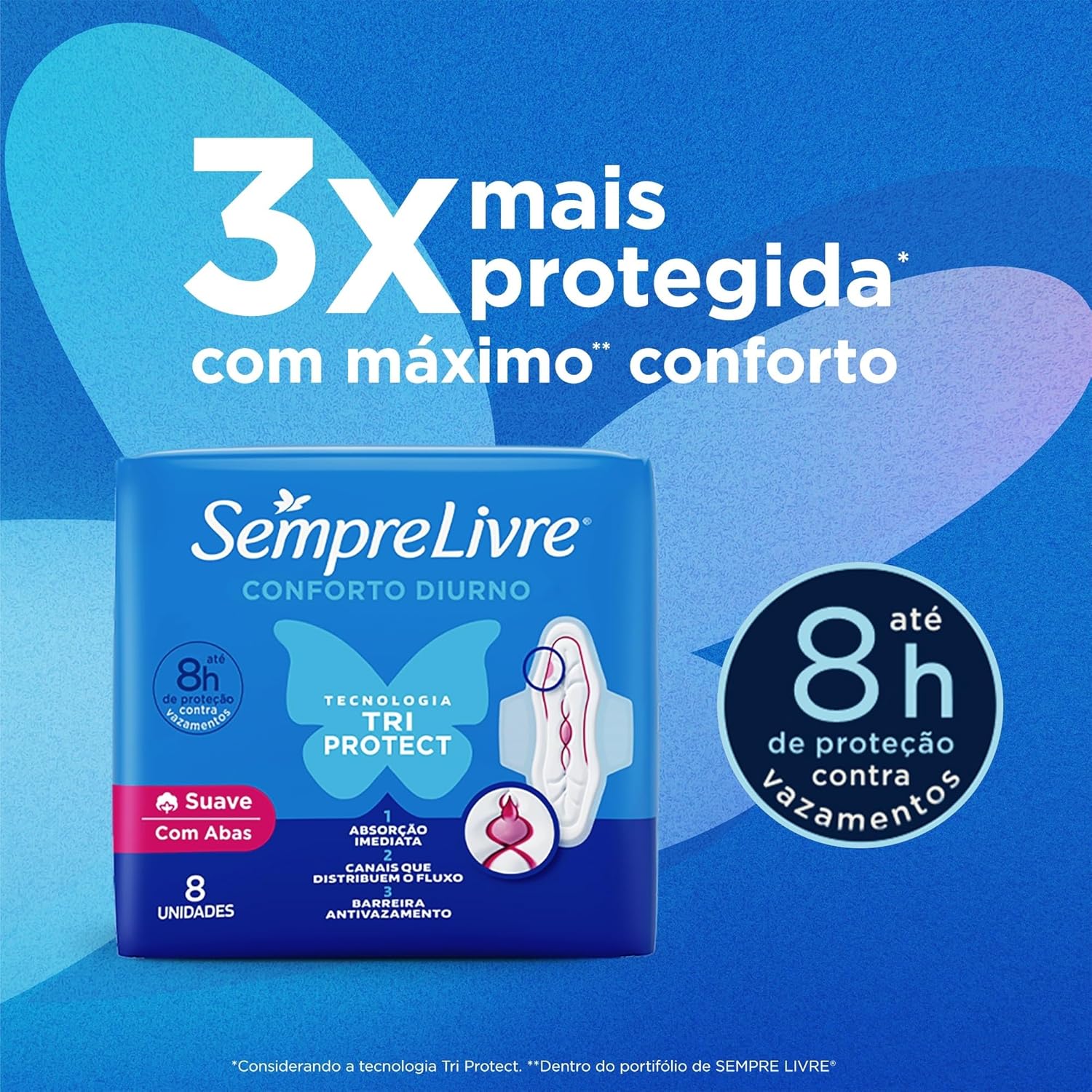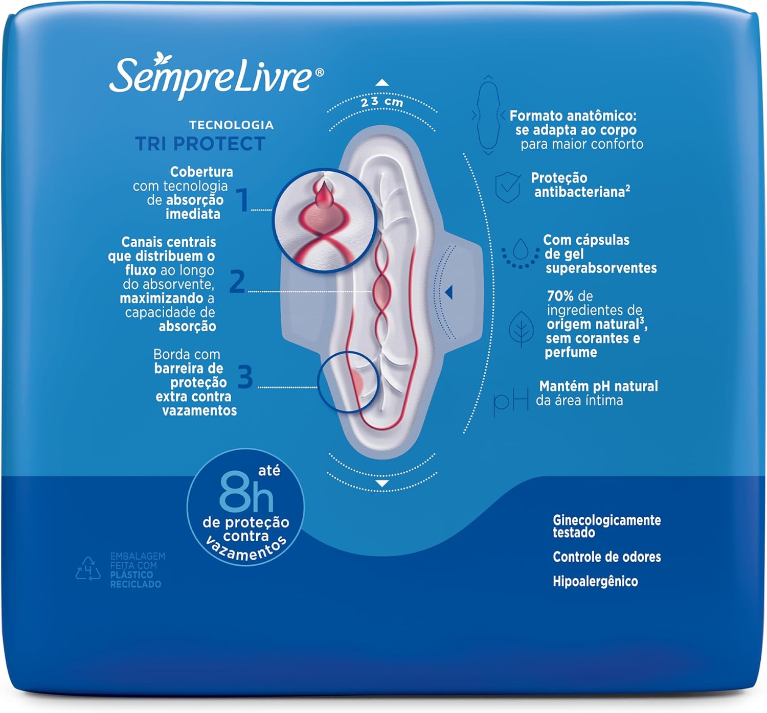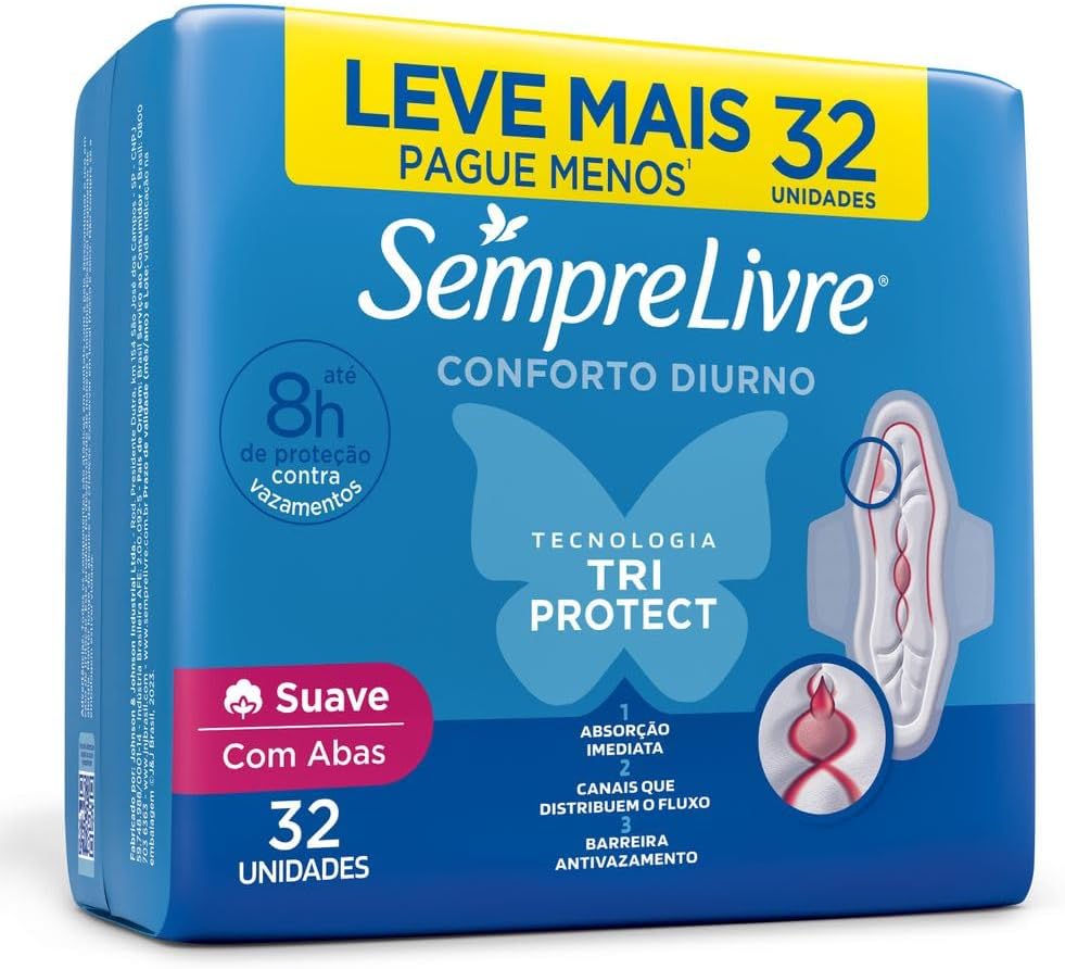 O produto conta com a tecnologia TRI PROTECT, que oferece absorção imediata, canais que distribuem o fluxo e uma barreira antivazamento.