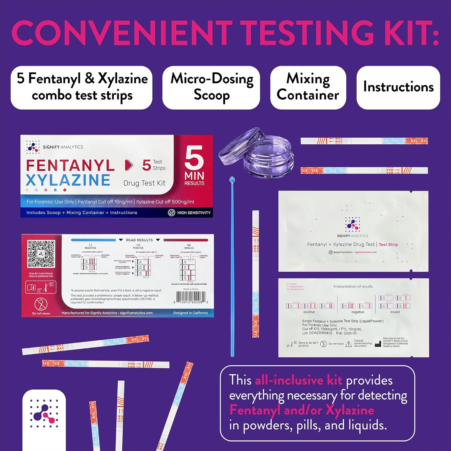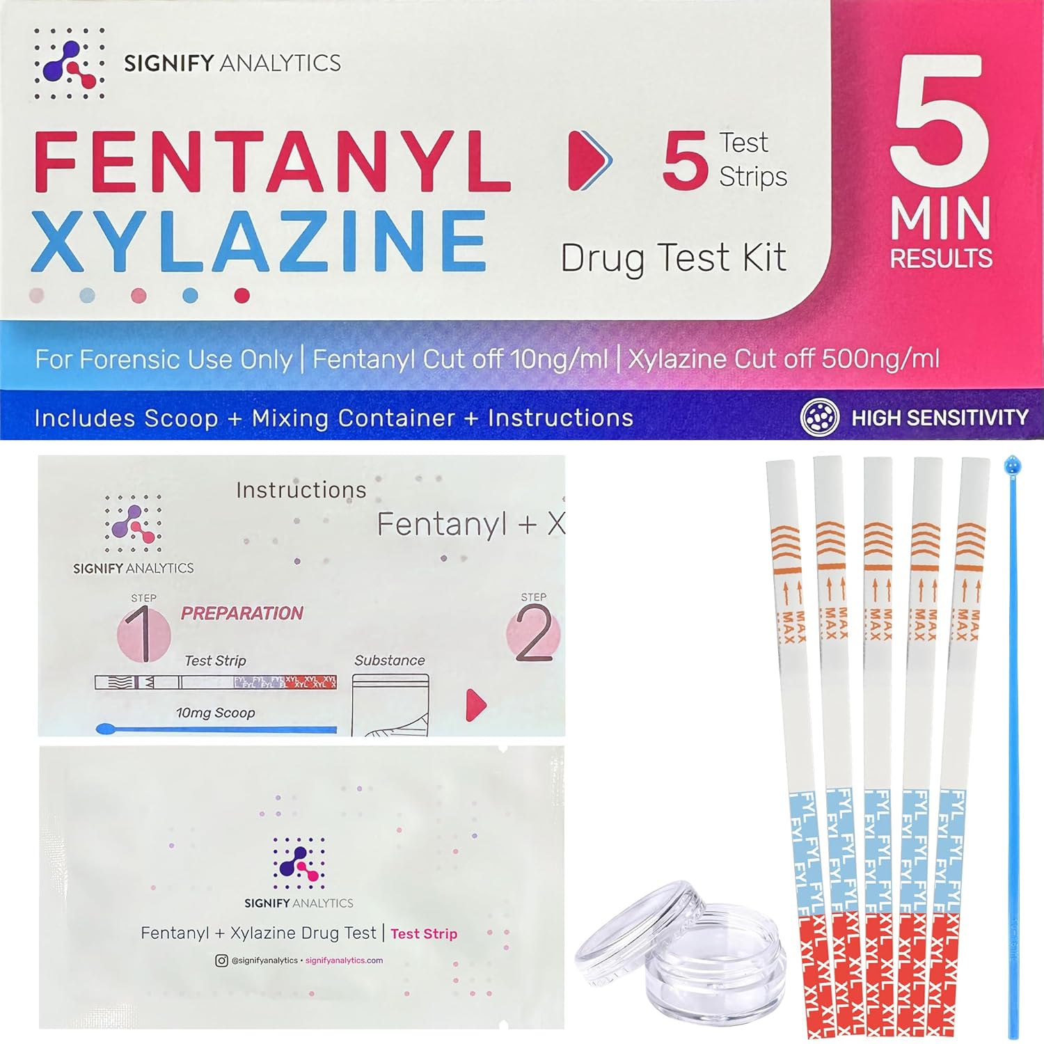 Signify Analytics kit de teste de fentanil e xilazina para comprimidos, pós e líquidos | 5 tiras de testes combinadas para fentanil e xilazina | tiras de teste confiáveis para comprimidos,