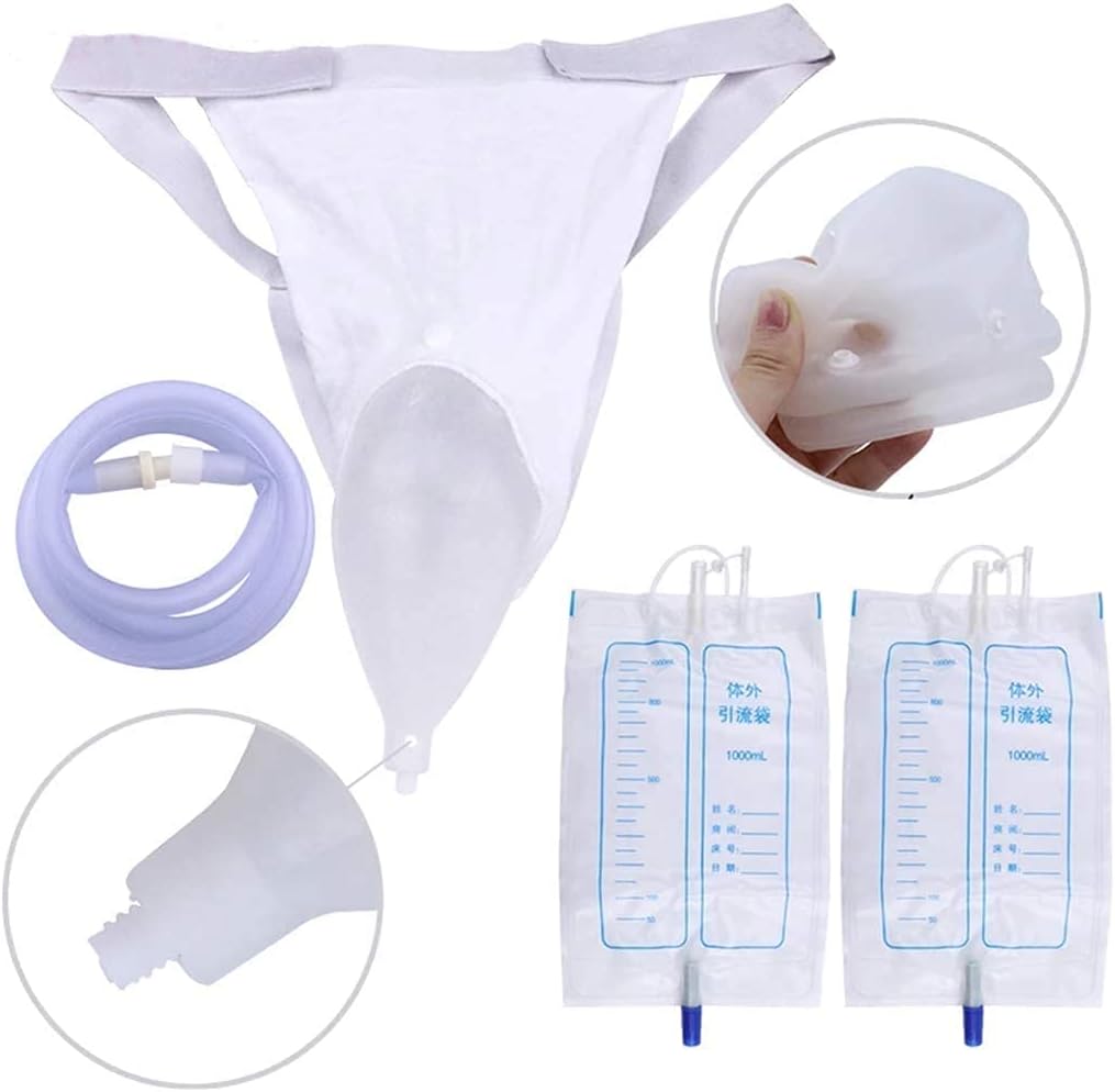 A embalagem inclui 1 coletor de urina, 2 sacos de xixi de 1000 ml e um tubo de látex de 3 cm.