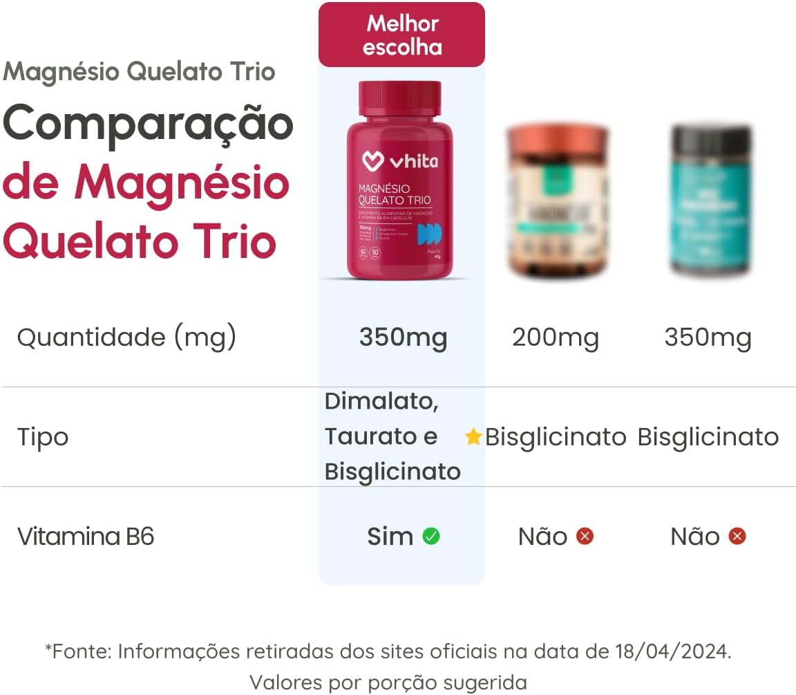 O Vhita Magnésio Quelato Trio combina três formas de magnésio: Dimalato, Bisglicinato e Taurato, enriquecido com Vitamina B6. Este suplemento é projetado para ajudar na absorção do magnésio, contribuindo para o equilíbrio do pH feminino. Cada frasco contém 60 cápsulas, com dimensões de 6 x 6 x 11 cm e peso de 53g. É fabricado no Brasil pela Vhita e possui uma avaliação média de 4,7 estrelas com base em 3.346 opiniões de clientes.